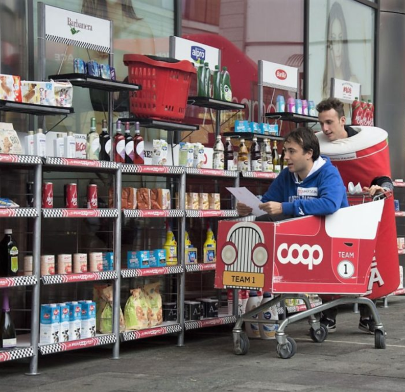 In palio buoni spesa fino a 1000 euro per si muove tra le corsie come piloti di Formula 1, indossando un costume a forma di lattina e conducendo un carrello con una persona al suo interno.