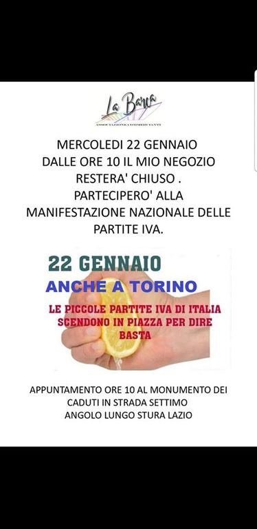 C'è poi chi fissa date e dà appuntamenti. Per esempio, in città - oppure nella prima cintura - compaiono molti manifesti con un'immagine di facile interpretazione: un limone spremuto da una mano che lo stringe con forza. Compaiono a Borgaro , ma anche nel capoluogo torinese, con un appuntamento fissato per le 10 al monumento dei caduti in Lungo Stura Lazio, all'angolo con strada Settimo.