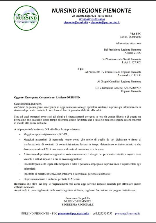 Vanno bene i ringraziamenti, ma da soli non bastano. E' questo il messaggio che Nursind Piemonte, sindacato che rappresenta infermieri e operatori sanitari, lancia con destinataria la Giunta regionale. E invita i lavoratori a fare lo stesso, scrivendo una lettera al governatore Alberto Cirio e all'assessore alla Sanità, Luigi Icardi.