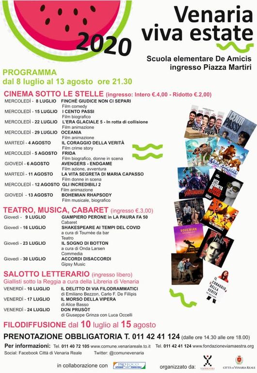 L'edizione 2020 di Venaria Viva Estate è stata organizzata dalla Città di Venaria Reale, in collaborazione con la fondazione Via Maestra, con il supporto logistico della Pro Loco Altessano Venaria Reale.