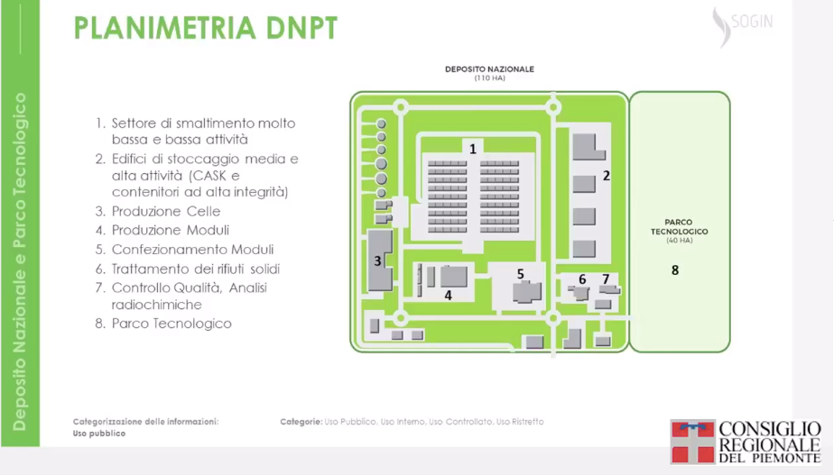 Secondo quanto descritto da Sogin, la Società di Stato incaricata dal Governo di occuparsi dello smantellamento degli impianti nucleari italiani e dello smaltimento dei rifiuti radioattivi, il Deposito unico occuperà circa 150 ettari, di cui 40 saranno destinati al Parco Tecnologico, dedicato alla ricerca scientifica. Gli altri 110 ettari costituiranno il vero e proprio deposito. In sostanza, i rifiuti a molto bassa e bassa attività verranno inseriti e cementati in moduli di calcestruzzo speciale, progettati per durare 350 anni. La struttura che ricoprirà i contenitori verrà realizzata cn strati di diversi materiali per impedire infiltrazioni di acque piovane, isolare i rifiuti dall'ambiente e migliorare l'impatto visivo della struttura.