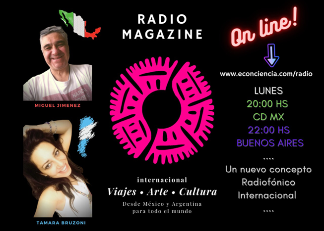 Esta semana, iniciamos también un programa de radio desde DF México. Co-Producido, en el cual participan invitados de cultura y arte de México y Argentina. Se puede escuchar los días lunes a las 22.00 en horario de Buenos Aires, y las 20.00 hs en DF a través de econciencia.com/radio