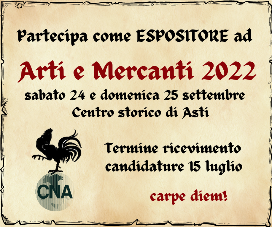 Dopo lo stop forzato degli ultimi 2 anni, la CNA di Asti torna ad organizzare ARTI E MERCANTI, rievocazione medievale che da oltre 20 anni chiude il settembre astigiano.