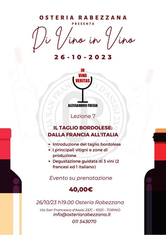 “Di Vino in Vino” sono le degustazioni guidate e raccontate da Alessandro Fresia, sommelier AIS. L’appuntamento di giovedì 26 ottobre esplora i vini di taglio bordolese, dalla Francia all’Italia. Dopo un’introduzione ai vini creati dall’assemblaggio di uve di vitigni utilizzati tradizionalmente per produrre i vini rossi di Bordeaux, si esplorano le zone di produzione e i principali vitigni per poi degustare 3 vini (2 francesi ed 1 italiano).