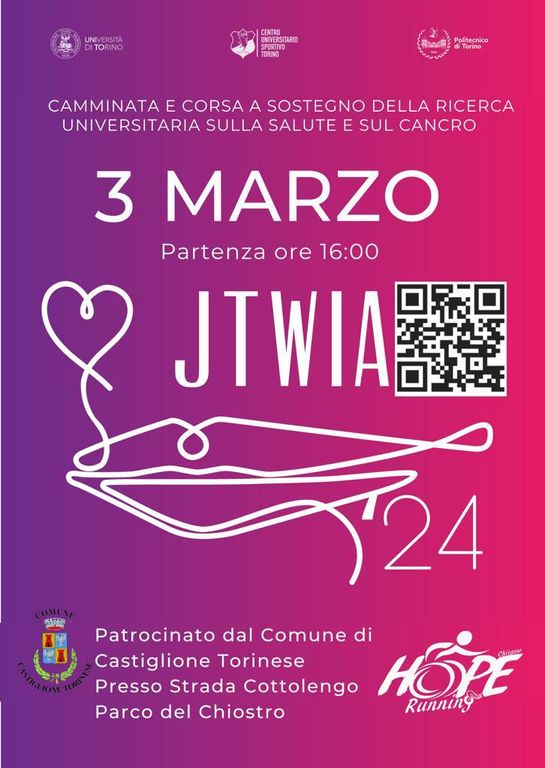La ‘Just The Woman I Am’ non è solamente una corsa-camminata a scopo benefico, è molto di più: sostenere la ricerca universitaria nella lotta contro il cancro è oggi più che mai importante e farlo in un’atmosfera di divertimento e allegria rende tutto davvero speciale. La JTWIA di Castiglione Torinese, organizzata con il patrocinio del Comune e con il contributo della Regione Piemonte, è una festa per tutta la famiglia. Una giornata inclusiva da non perdere, unica nel suo genere. Allacciati le scarpe e unisciti al divertimento!