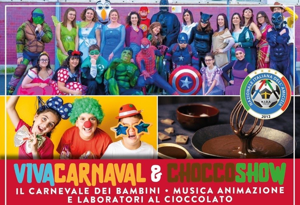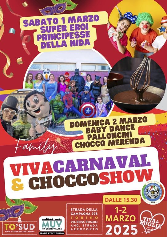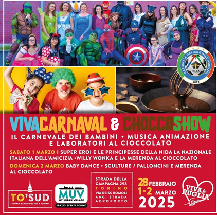 Dalle ore 15.30 : “Viva Carnaval & Chocco Show” il Carnevale per i Bambini di TO-SUD e Viva la Puglia con Baby Dance, Musical e Principesse e Supereroi della N.I.D.A la Nazionale Italiana dell’Amicizia, Animazione , Willy Wonka. La Super Merenda al Cioccolato. Battaglia dei coriandoli.