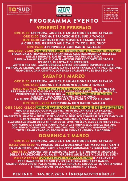 Dalle 15.30: “Viva Carnaval & Chocco Show” il Carnevale per i Bambini di TO-SUD e Viva la Puglia con Baby Dance. Grandi Sculture di palloncini. La Merenda al Cioccolato. Coriandoli e premiazione della maschera più bella.