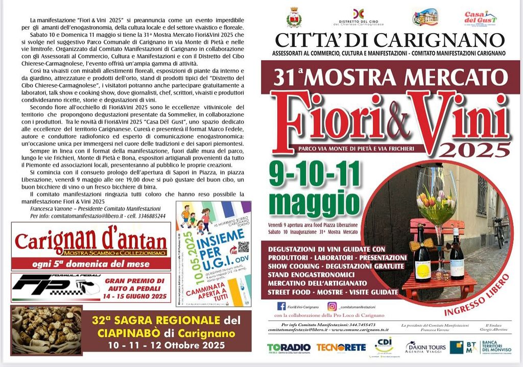 Domenica 11 maggio si preannuncia come una giornata clou per gli amanti del buon gusto all'interno della 31° edizione della Fiera "Fiori & Vini" di Carignano. Se l'intero fine settimana sarà un tripudio di profumi e sapori, la domenica sarà particolarmente dedicata alla scoperta delle eccellenze Gastronomiche e Vitivinicole del territorio e, soprattutto, al debutto di "Casa Dél Gust"presso il Parco di Via Monte di Pietà .