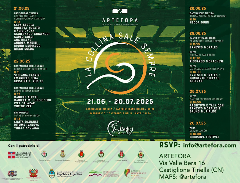 L’edizione 2025 dell’evento si apre simbolicamente nel giorno del solstizio d’estate, rafforzando il legame tra l’esperienza artistica e il paesaggio, tra il tempo naturale e quello della creazione. Nell’arco di un mese, ventidue artisti internazionali provenienti da Italia, Argentina, Perù e Lettonia saranno protagonisti di un articolato percorso espositivo che coinvolgerà sei comuni tra Langhe e Monferrato – Castiglione Tinella, Castagnole delle Lanze, Barbaresco, Santo Stefano Belbo, Neive e Alba – trasformando chiese, torri, fienili e cantine storiche in luoghi d’arte e di riflessione.