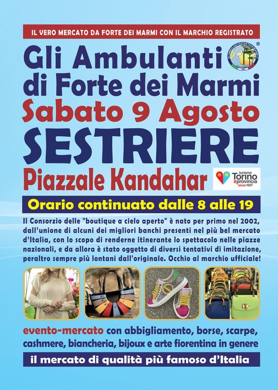 Gli Ambulanti di Forte dei Marmi®, le bancarelle del mercato di qualità più famoso d’Italia, tornano finalmente per l’estate a grandissima richiesta per Val Chisone e Val di Susa con il loro show itinerante all’insegna del meglio del Made in Italy artigianale e delle ultime tendenze della moda. Si potranno infatti ammirare le ormai mitiche boutique a cielo aperto® dell’originale Consorzio domenica 10 agosto a SESTRIERE, nella centrale location di Piazzale Kandahar. Dunque, un appuntamento da non perdere assolutamente per i tanti appassionati del genere, che lo hanno a lungo reclamato: una rassegna dello shopping più glamour e conveniente, con orario continuato, anche in caso di maltempo, dalle 8 alle 19.