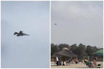 (Adnkronos) - In spiaggia a Dubai ombrelloni aperti e turisti in costume, in cielo scene di guerra. Un video condiviso sui social mostra un F-16E dell'aeronautica militare degli Emirati Arabi Uniti che piomba a bassa quota sulla spiaggia di Al Mamzar per abbattere un drone iraniano in avvicinamento.
