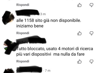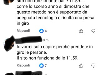Mentre il sito è bloccato, sono decine i commenti di genitori infuriati apparsi sulla pagina facebook della Regione Piemonte, sotto il post dedicato a Vesta. La maggioranza scrive "Il sito non funziona dalle 11.59" oppure "dalle 11.58 non si apre la pagina". Un altro utente aggiunge "Tutto bloccato, usato 4 motori di ricerca più vari dispositivi ma nulla da fare". C'è poi chi attacca duramente: "Siete andati a pranzo e vi siete dimenticati di attivare il portale?", "Vergognosi", "Ridicoli".